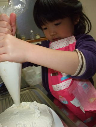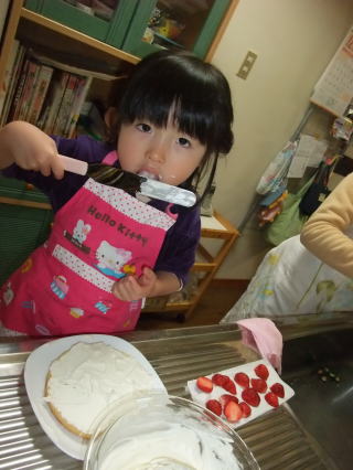 | スポンジの間にクリーム&イチゴ | 最後にクリームでデコレーション |