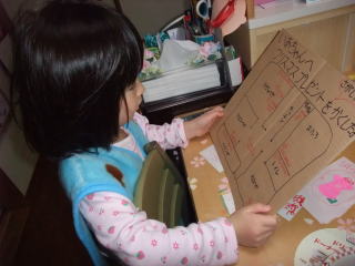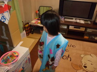| あれ、枕元にプレゼントが無いな。。。 こんなところにお手紙があるけど、このダンボール紙はナンダロウ?? 「いあちゃんへ クリスマスプレゼントをかくしたよ さがしてね」だって! よーし、探すぞー |  |