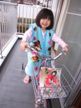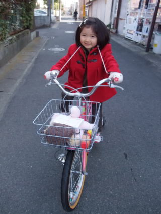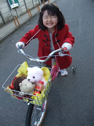 | 足が届かない・・・ ちょっと大きいね でも、走ると気持ちいいい カゴにお友達を乗せて お出掛けだよ〜 |  |