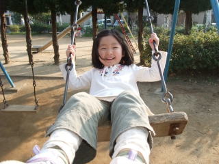 |  | ブランコで楽しく遊んだ後は、自転車の特訓です。おとさんが、アーシロ、コーシロとうるさいです。 |
