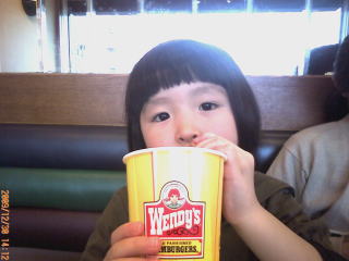 |  | 今日からママ実家に帰省しますが、その前に、明日で閉店するウェンディーズ(ハンバーガーショップ)でお昼ごはんを食べてからにします。 日本にあるお店が全部無くなっちゃうんだって。依亜はこの店がスキだったのに、残念だな〜。 |