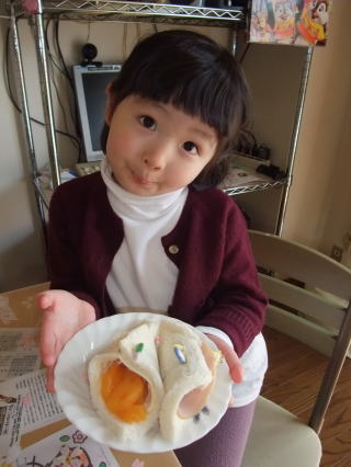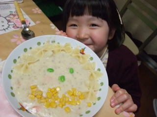 |  | おとさんが、クリームパスタに枝豆とコーンでお顔のお絵かきしてくれたよ。カワイイでしょ? |