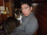 | 冴えない顔のおとさんと、おじいちゃん猫のクロちゃん  おとさんの大きなお腹は、座り心地が良いみたいだね | |