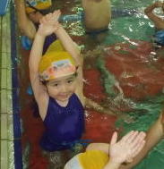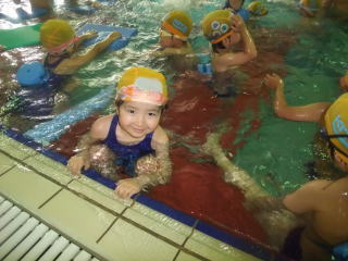 | 今日は水泳教室 特別にプールサイドまで おかさんも入ることが出来ました。 カッコいいところ見せちゃうよ!  |  |