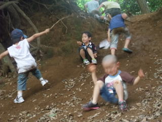 |  | 私はといえば、みんなが駆け上る急な崖を登り。そしてズズズズッっと滑り降りて、泥まみれ。 |