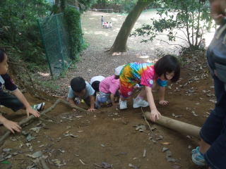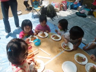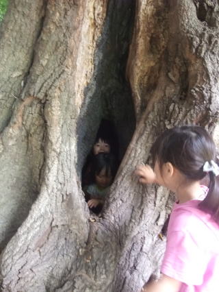 | 大きな木の中に1人2人3人と入ることもできます。お友達と一緒なら怖くないよ。  | お友達と一緒の お食事タイムも格別! でも食べるより遊びたい♪  |