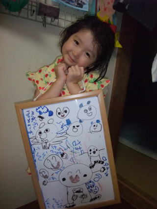 | ホワイトボードいっぱいに書いた絵を消しちゃうんだって、ずーっと大切に消さないでとっておいたのに・・記念撮影しておこう。 |  |
