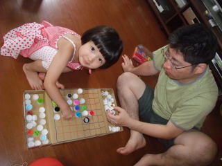 | おとさんリーダーのもと、カラフルなオセロを作ったよ。ペットボトルのキャップに色を塗ったり、絵を書いたりしたんだよ。 オセロは角を取るのが大事だね。  | |