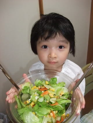 | オセロは頭を使うんだね。 お風呂に入りながら 甘くて冷たいアイスを食べて 頭の中もリフレッシュ  |  さぁ、おとさんは 依亜サラダを食べて 明日からもお仕事頑張ってね。 |