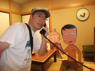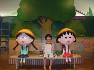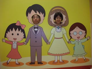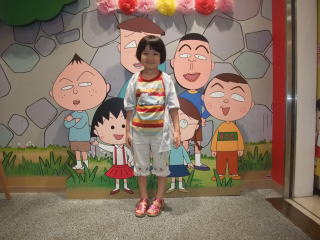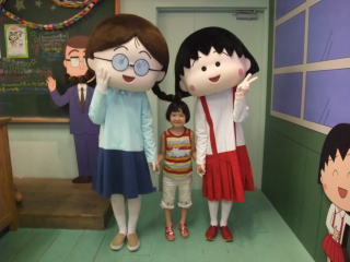 | そして、毎度おなじみのサプライズ。 ここは、ちびまる子ちゃんランド じゃあ、依亜と一緒に入ってみよう!! @入り口でまるちゃんが迎えてくれるよ。 今日は清水エスパルスの試合の日だから、ユニフォームを着ているんだって。  | Aまるちゃんのお家には、家族が勢ぞろいして賑やかだね。 あれ?電話が鳴っているよ〜  |