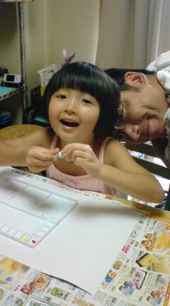 |  | 7月最後の日 絵の具でお絵かきをします おとさんも手伝ってね あと、8月もイッパイ遊んでね〜 |