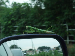 草刈が終わったら、車にカマキリ君が乗っていました。旅は道連れ、、、一緒にドライブすることに。