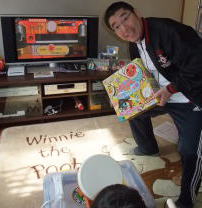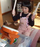 | 我が家に、テレビゲーム機が初登場! 景品であたった「任天堂ウィー」です。 携帯用ゲーム機「DS」と悩みに悩んで、おとさんの説得工作に負け、DSを諦めた依亜ですが、その殺し文句は「太鼓の達人」というゲーム。 小さなDSで遊ぶより、ウィーの方が楽しいよって言うから・・・ その「太鼓の達人」もお家に届いて、いざ勝負!! | |