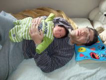 |  | 朝は、おとさんのお腹でネボスケ君
