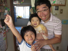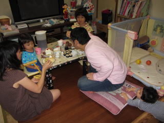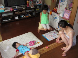 |  | 4人でスゴロク大会 ロクのサイコロは依亜が振ってあげるね。 おとさんの手作りスゴロクは絶妙で面白いですよ。みんなも遊びに来てね。 |
