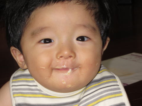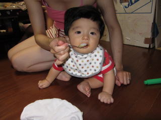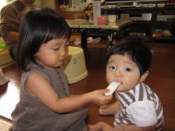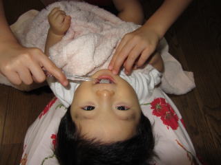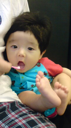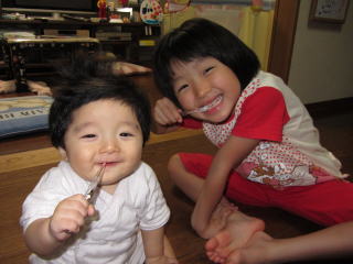 | ご飯を食べたら、歯磨きタイム  | 歯が生えていないけど 歯磨きは楽しい緑之助 お姉ちゃんに磨いてもらって 楽しさは倍増ですね。  |