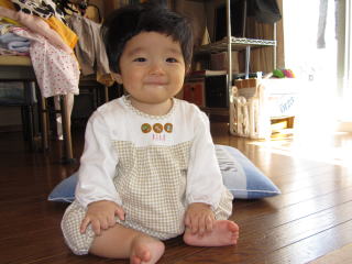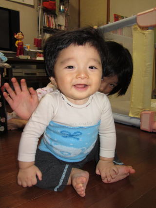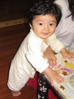 |  | 緑之助7ヶ月  掴まり立ち。。。 こりゃ大変だ、机の上のものを片付けろ〜! |