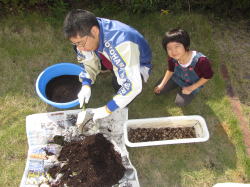 | おとさんのお手伝い ゴーヤが入っていたプランターの土を綺麗にお掃除するんだよ ウギャー ナンカの幼虫が沢山でてくるよ〜 |  |