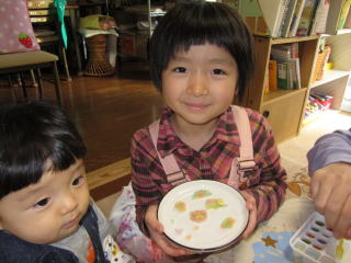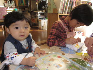| おねえちゃん、絵の具でお絵かき 楽しそうだな〜  | ロクちゃん違うよ。絵の具じゃないよ。 色水でグミを作れるお菓子なんだ〜! さぁロクちゃん、これあげるから、おかさんとお出かけしてきてね。  |