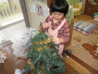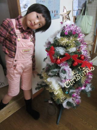 | おかさんとロクがお買い物に行ってる間に、おとさんとクリスマスツリーを飾ります。  | ほーら、こんなに素敵にできちゃった  |