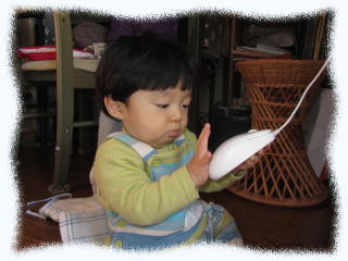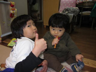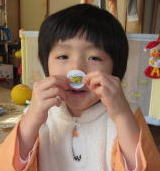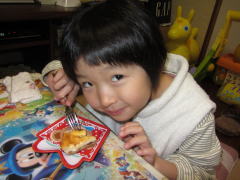| 緑之助の食べっぷりは凄いね。お姉ちゃんのケーキもペロリと食べてくれて、うれしいよ。 やっぱり手作りは特別おいしかったでしょ? あれ? 太鼓のバチもオイシイの? あぁ ロクは口に入れば何でもイイのか・・・ |  |