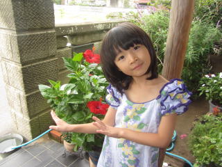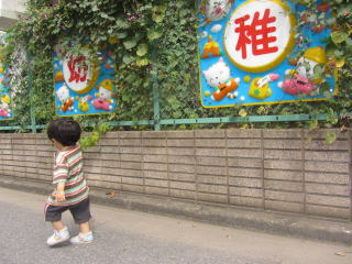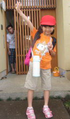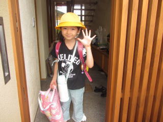 |  | 2学期の始業です。 宿題など大荷物を抱えて「いってきまーす」 工作のタワーやアサガオの鉢は、おかさんが自転車で運んで行きました。 |