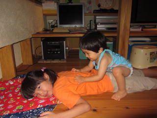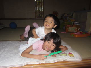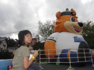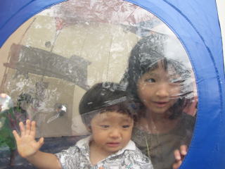 |  緑之助は不安いっぱいでフワフワに入りましたが、早々に泣き出してしまいました。お姉ちゃんは元気いっぱい走り回っていました | |