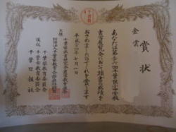 |  | 県の書写展覧会『金賞』 夏休みの宿題です お友達は特賞もらったとのことですが、違いは歴然! 金賞も”参加賞”的なものかな? 依亜さん、来年は頑張れっ |
