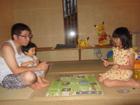 |  | 夜は3人でカードゲーム大会をしました。 ポケモンのゲームなので、緑之助が並べたカードを気になって、我慢できず飛びついてしまい、ゲームが中断しっぱなし・・・ |