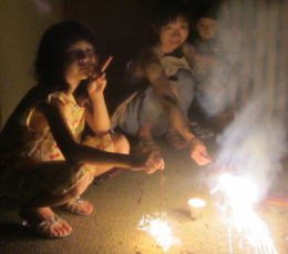 |  9月も終わりですが、昼間にお祭りに行ったので、夜は残っていた花火をしました | |