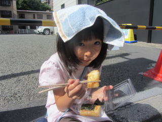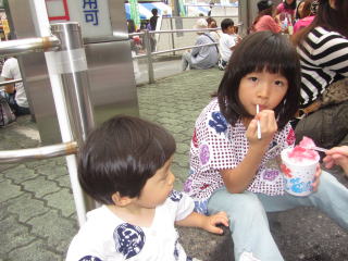 | お祭り会場は今年も大混雑。 お祭りの日にしか買えないお赤飯 定番のかき氷、磯辺焼き お外で食べるのは楽しいね |  | |||