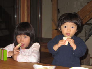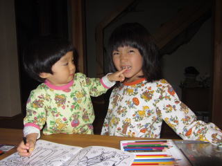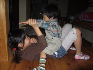 | ケンカ!? いやいや遊んでいるだけ ・・・・ お姉ちゃんお菓子を返せー やっぱりケンカなのか |  | |||