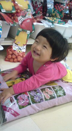 | お庭に植える球根を買いに来ました 来年の春に咲くんだって。 何色がいいかな?  | 僕もお手伝いするよ お庭に撒く土を持ってあげる うーん うーん 重いけど大丈夫  | |||