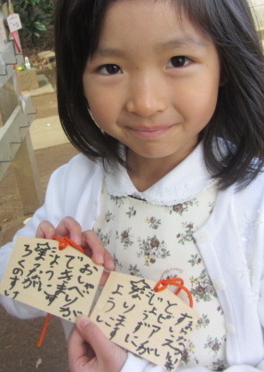 | 絵馬を貰いました 依亜 : すいえい と ピアノが じょうずになりますように 緑之助 : おしゃべりが できますように | |