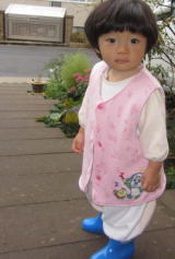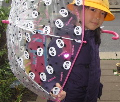 | 幼稚園で使っていた傘は、依亜の体に合わせてくれるはずもなく。。。 新しい傘は透明で安全第一!パンダ模様で可愛いのよ  | おかあさーん 長靴を履いたよ 公園に行ってもイイ?  |