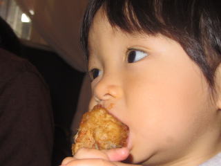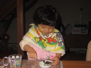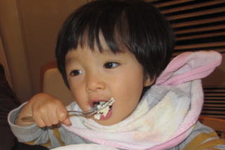 | お姉ちゃんのピアノ発表会のお祝い。七五三のお祝い。としてママババが”いつものレストラン”にご招待してくれました。 緑之助、、、食べる  | 食べる  |