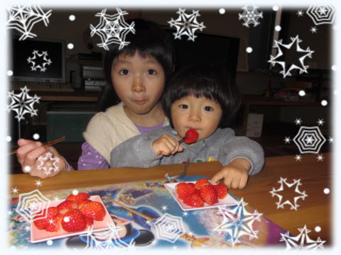 | 今日も冷凍イチゴが食べられて幸せ 二人とも、お皿に乗っているイチゴの数も大きさも同じにしているのですが、わずかでも多い方を互いに狙っています |  |