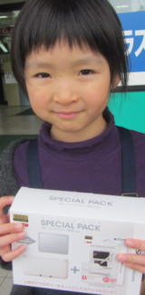 |  | 念願の携帯ゲーム機(3DS)を買ってもらいました。 依亜からオネダリはしていないよ。 ピアノ発表会のご褒美なんだからね。 やったー! おかさん おとさん ありがとう。 |