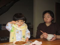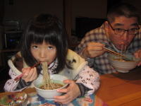 |  | 年越しそばをいただきます。 ズルズル〜 おいしいね おっと、緑之助は年越し焼きそばなんだね  |