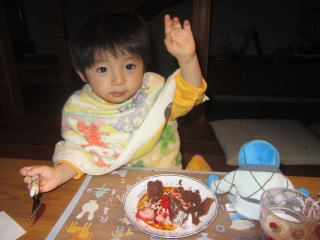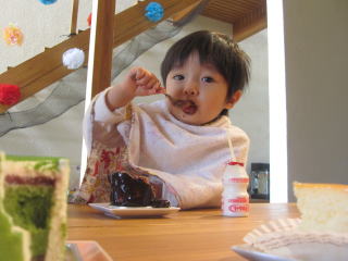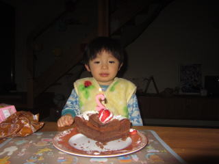 | 2歳だから、階段を昇るスピードも速くなった気がする。うんしょうんしょっ  | 今晩も美味しすぎるケーキが目の前に  もう待ちきれませんぞ |