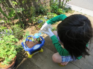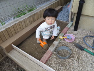 お姉ちゃんが学校で育てるトマトのお世話をしている間、お砂場で遊ぶ。