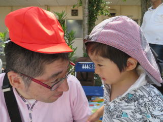 僕、ちょっとヒマ中なので、お父さんと帽子の交換をしてみました。