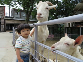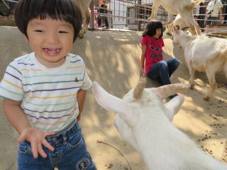 ヤギと2ショットで撮って!さあ、閉園だから帰るよ