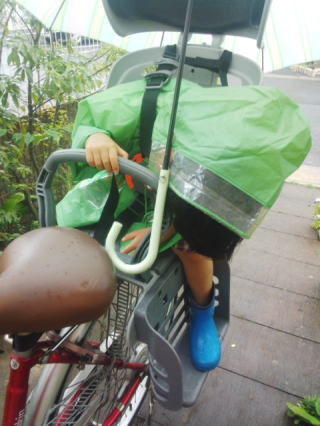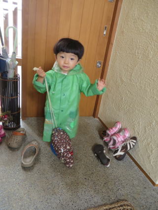 | 雨が降っているから、雨合羽でお出かけです 行ってきまーす