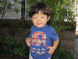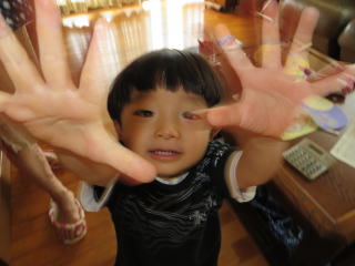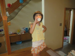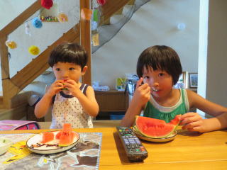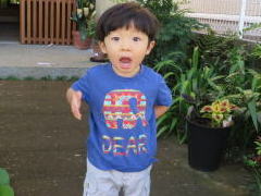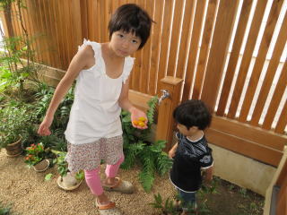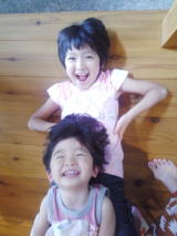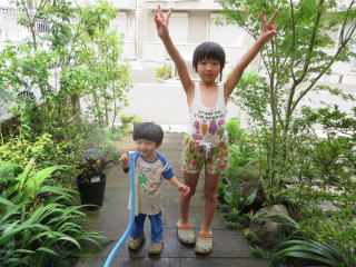 |  | 私たちは元気いっぱい。 朝からお庭のスプリンクラーでシャワーを浴びてパジャマはビショ濡れ。