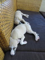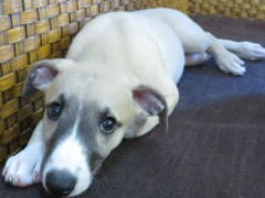 | ということで、会いに行くことにしました。ウィペットという犬種は馴染みがなかったけど、とても飼いやすく、お利口なようです。室内犬で家では寝ていることが多く、寒さに弱いのですが、とても走るのが早く、格好良い一面もあるのです。 |