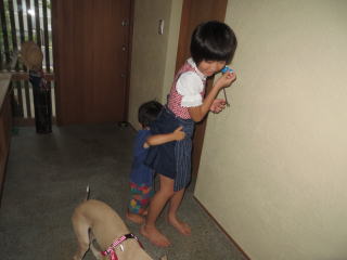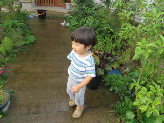 お庭に出るのも怖々2013年8月8日 よーし、今日もお手伝いしちゃうもんね