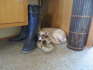 (首輪が緩くてすり抜けてしまうので、二重にしました。これなら抜けられないはずなんですけど・・・)玄関に飾ってあった依亜の作品。SUNに壊される前に記念撮影、そして処分しました。