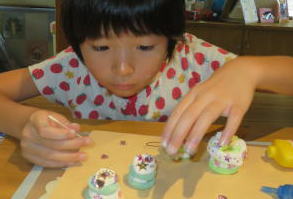 緑之助、一緒に連れていけなくでゴメンよ。ご本を読み聞かせしてあげるから許してね。2013年8月18日 紙粘土、樹脂粘土などでケーキを作っています。夏休みの宿題は今年も工作にしました。