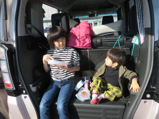 2013年12月1日 ショッピングセンターの駐車場でお昼ごはん。ポカポカ暖かいので、車の荷台に座り食べていましたが・・・ 緑之助が依亜のカレーライスに誤って手をズボッと突っ込んでしまい、大慌てするのでした。